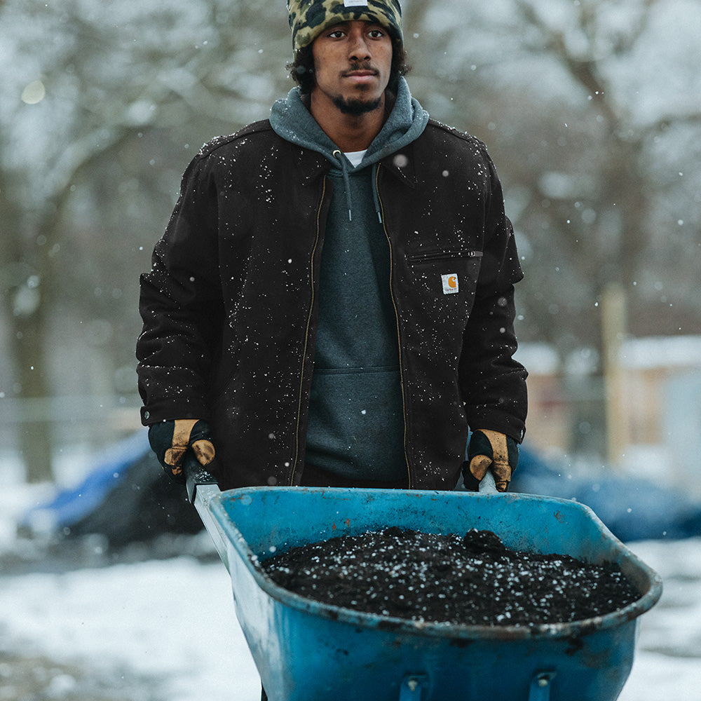 The original Carhartt Detroit jacket built a reputation for toughness on the backs of warehouse workers, farmhands and ranchers across America. With its signature corduroy collar and heavyweight fabric, this updated Carhartt Detroit jacket is a rugged layer worthy of any job.